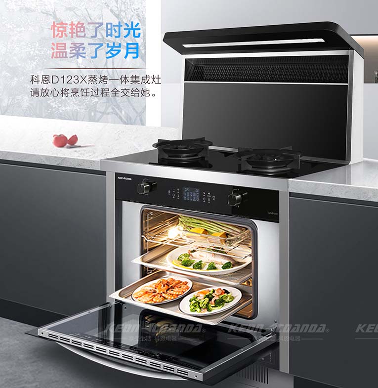 科恩D123X變頻蒸烤消一體智能集成灶為什么頗受消費者的喜愛,原因有以下幾方面:1.省空間:科恩D123X集合煙機、燃氣灶、蒸箱、烤箱、消毒柜等多種功能于一體,不僅節省空間還能省下一米櫥柜空間。2.吸油煙能力強:比起傳統煙機,科恩D123X離灶臺距離更近,吸力更強,在油煙產生的第一時間就可以將其吸走,另外油煙的過濾網采用不沾油特氟龍材料,易清洗、耐高溫、抗腐蝕!3.大火力爆炒:尤其是爆炒菜,D123X鑄鐵鍋架帶雙聚能環設計,四通道獨立引射5.0KW大火力猛火爆炒,寬裕立體上進風充分燃燒,提高燃燒效率,降低一氧化碳排放。