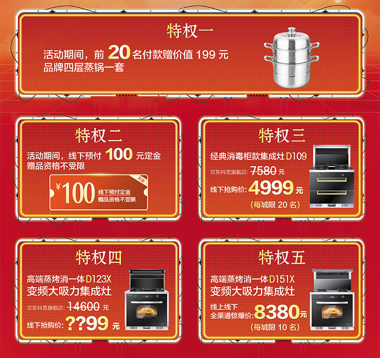 科恩電器一直倡導(dǎo)“樂享智慧烹飪”,本次活動(dòng)也將以“集成智慧廚房”為宗旨,將活動(dòng)產(chǎn)品鎖定與高端產(chǎn)品上。據(jù)悉,本次集成灶十大品牌、廚電行業(yè)十大品牌科恩電器攜手京東商城五一狂歡活動(dòng),只為讓一直以來支持科恩電器的消費(fèi)者花最少的錢購到心儀的集成灶,五大特權(quán)優(yōu)惠、搶名額、搶補(bǔ)貼,超劃算的活動(dòng)肯定讓你心動(dòng)。