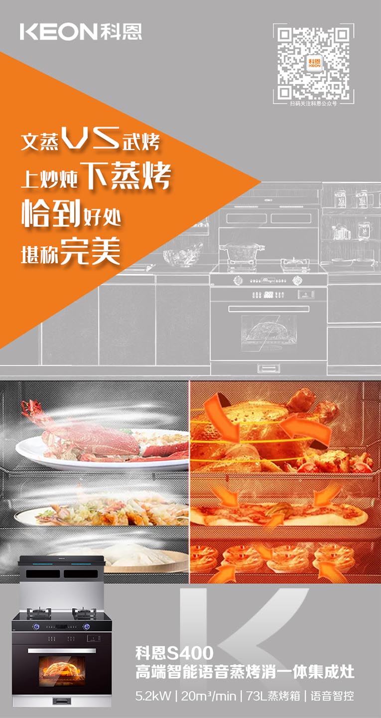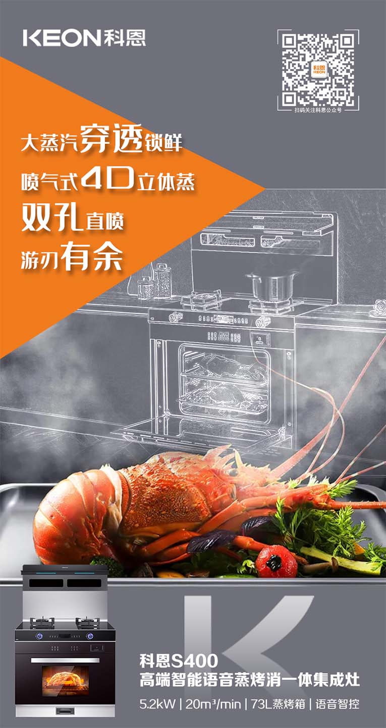 當代年輕人的“懶”癥可謂是人盡皆知,因此烹飪美食時,只求一次搞定!有效提升烹飪效率,集成灶十大品牌、廚電行業十大品牌科恩S400變頻大吸力蒸烤消一體集成灶上下平整加熱加右側雙孔蒸汽噴射,迅速升溫,美味加速,四面受熱均勻,營養不流失。