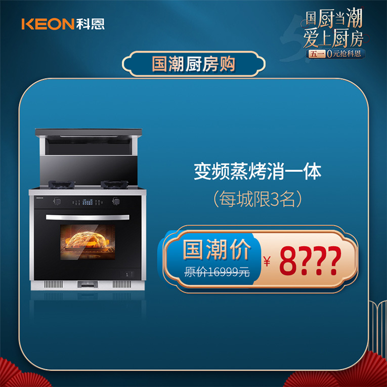 驚喜福利,重磅升級!科恩集成灶“廚房新國潮科恩新三件”產品火爆來襲,變頻蒸烤消一體集成灶、經典消毒柜款集成灶、多功能集成式凈水器驚喜大放價!