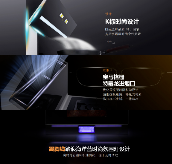 科恩C系列兩款王炸產(chǎn)品:C200消毒柜款集成灶、C260蒸烤消炸一體集成灶,在預(yù)熱期間就極具熱度,如今終于華麗登場,從外觀來看,此次的C系列完全顛覆了以往集成灶笨重且不夠美觀的形象,創(chuàng)造性的采用了企業(yè)標(biāo)識“K”字型時尚機頭,寶馬經(jīng)典格柵設(shè)計進(jìn)煙口,以及踏浪海洋藍(lán)時尚氛圍燈底座設(shè)計,盡覽奢美,構(gòu)筑視覺與觸覺的全新想象,一眼,鮮明,再睹,目不轉(zhuǎn)睛!