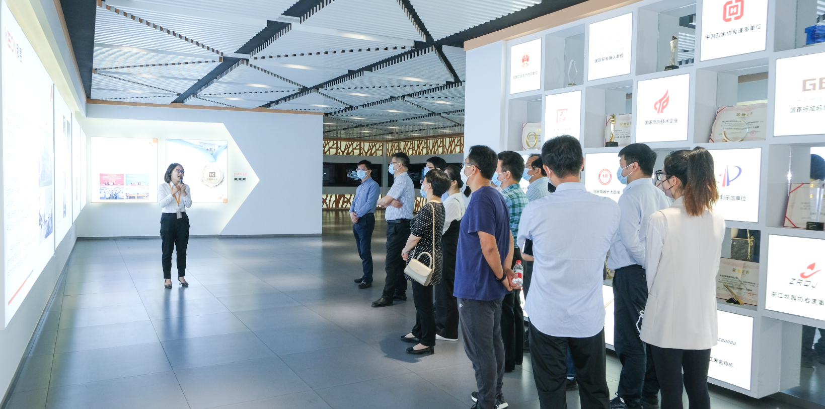 商部長一行領導在科恩招商部張君麗的講解帶領下,參觀了科恩集團的文化長廊和大型現代化智能展廳,深入了解企業文化及發展歷程,詳細詢問了企業生產運營、科研創新、品牌特色、黨建工作等方面情況,并就科恩以科技和感恩為企業初心,本著共創共贏共享的經營理念表示了高度認可。