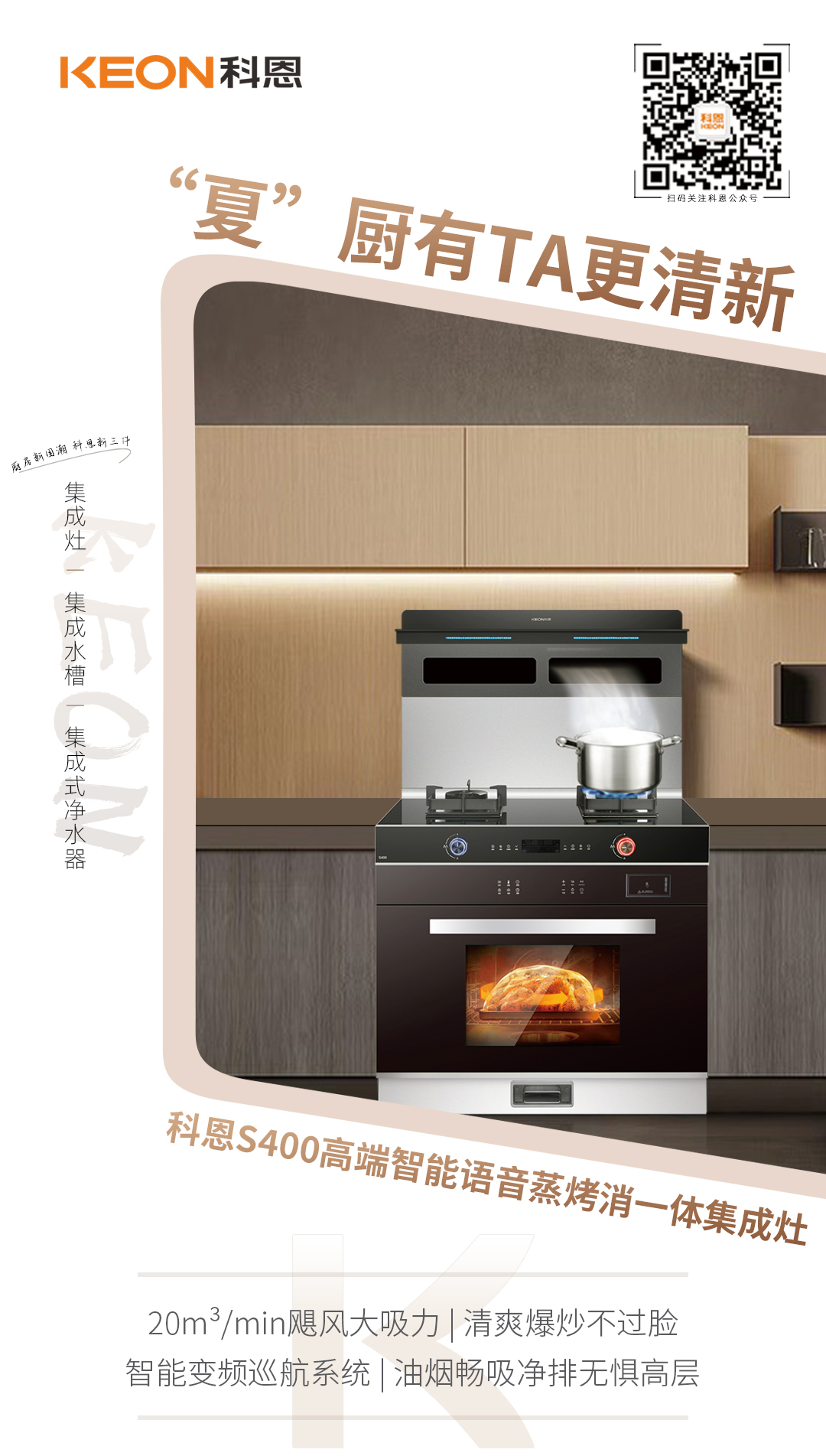 每一次下廚時的揮汗如雨,都是對愛的最好詮釋!科恩S400高端智能語音蒸烤消一體集成灶,20m3/min颶風大吸力,720Pa大風壓,瞬吸惱人油煙,清爽爆炒不過臉,當熱浪遇見清風,悶熱煩躁一吹就散了,只留下如春風細雨般溫然如潤,智能變頻巡航系統,化身“斗暑圣戰(zhàn)士”,油煙暢吸凈排,無懼高層,烹飪高峰亦可游刃有余,于酷暑中守護家人的一日三餐!