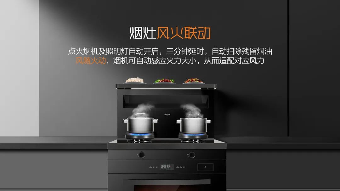A3系列不僅煙灶聯(lián)動,更風隨火動,煙機可自動感應火力大小,從而適配對應風力。