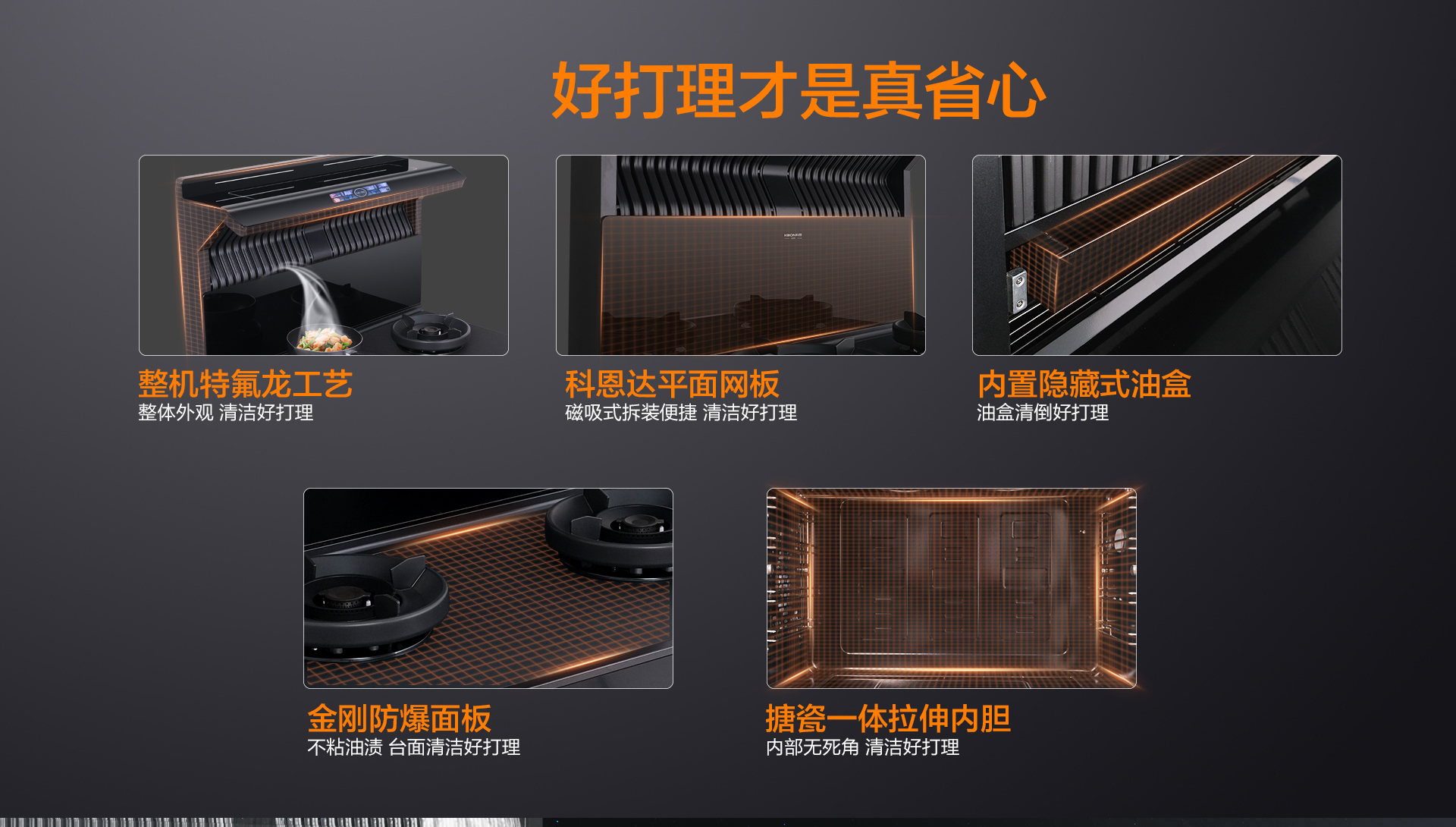 1. 防爆免清洗集成灶整機采用特氟龍工藝,不沾油好打理,污漬一抹即凈!