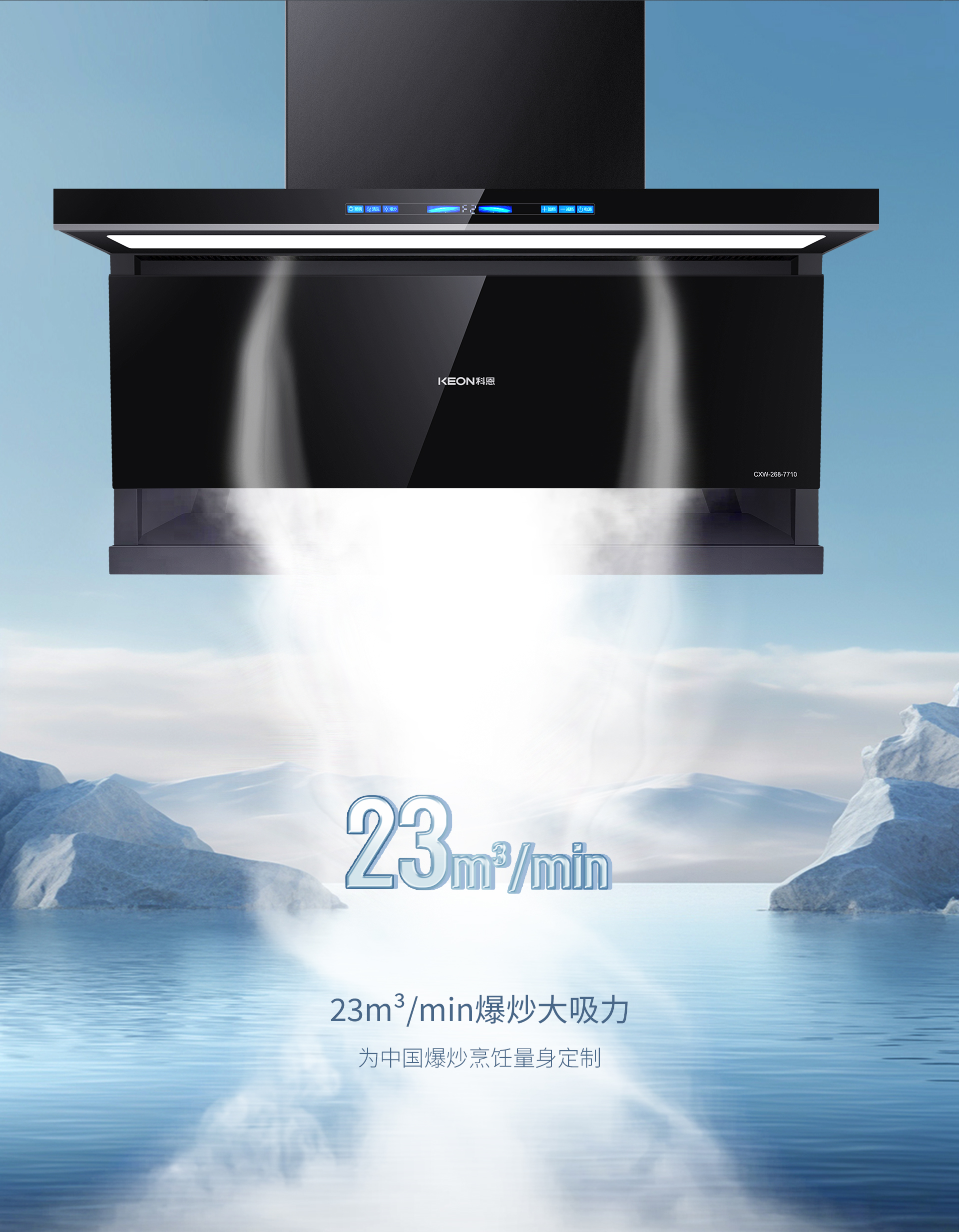 面對中式烹飪中常見的重油爆炒,它也能從容應對,23m³/min的強勁吸力如颶風過境,瞬間將油煙吸凈,還廚房一片清新。