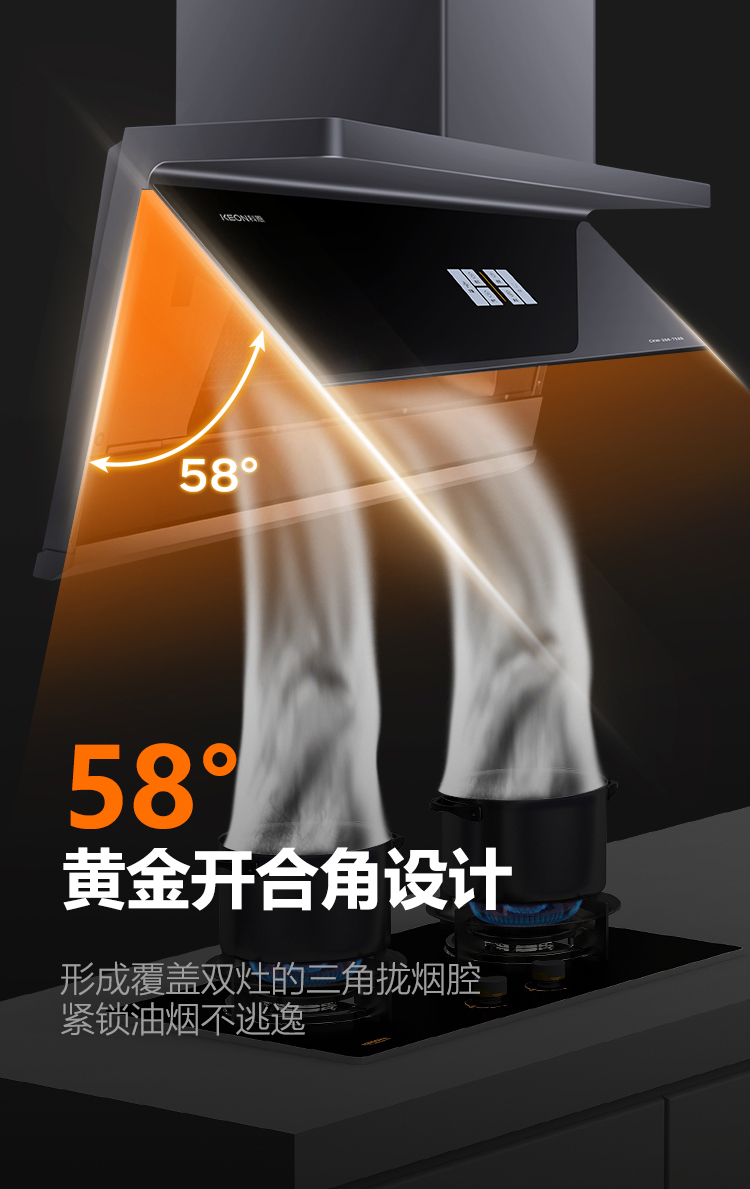 28m³/min 颶風(fēng)吸力,爆炒油煙瞬凈。1060Pa 強(qiáng)風(fēng)壓,無懼公共煙道阻力。讓廚房空氣時(shí)刻清新。900mm 開合攏煙屏+58°黃金開合角,形成覆蓋雙灶的三角攏煙腔,緊鎖油煙不逃逸,低空近吸讓油煙未升騰即被鎖定,從此告別油煙撲臉的尷尬。