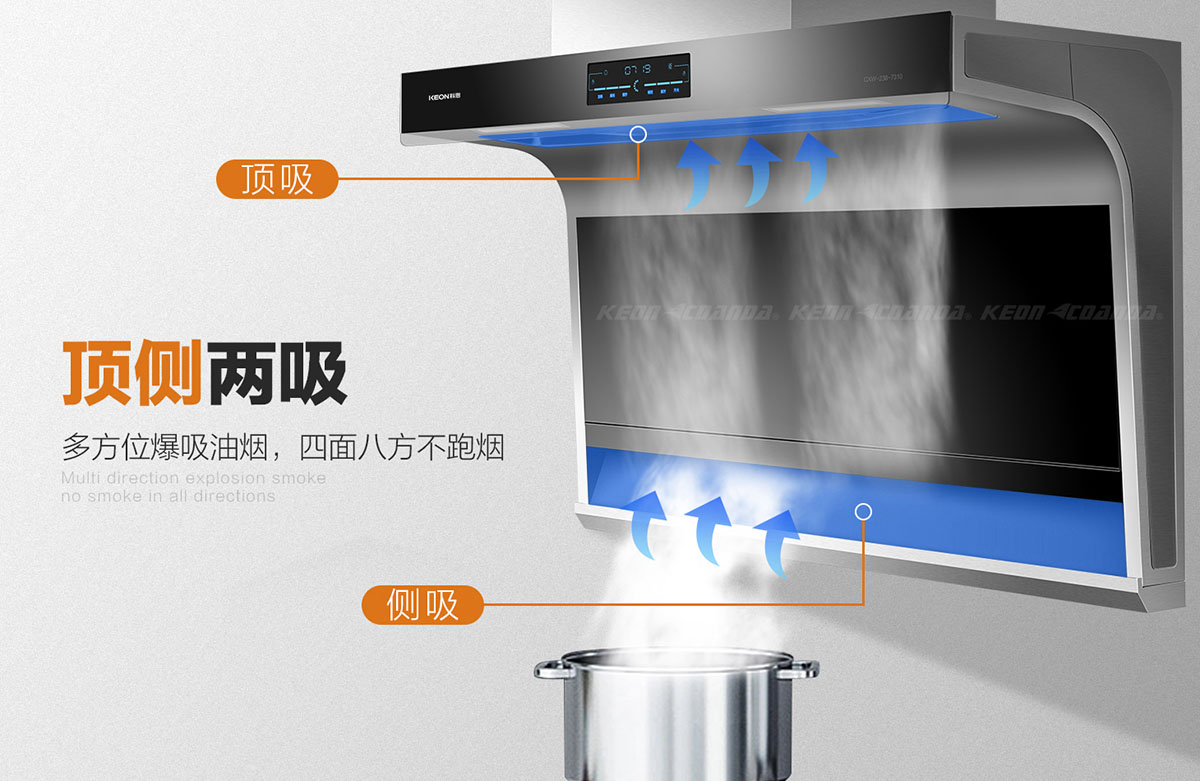 - 頂側(cè)兩吸,多方位爆吸油煙,四面八方不跑煙。