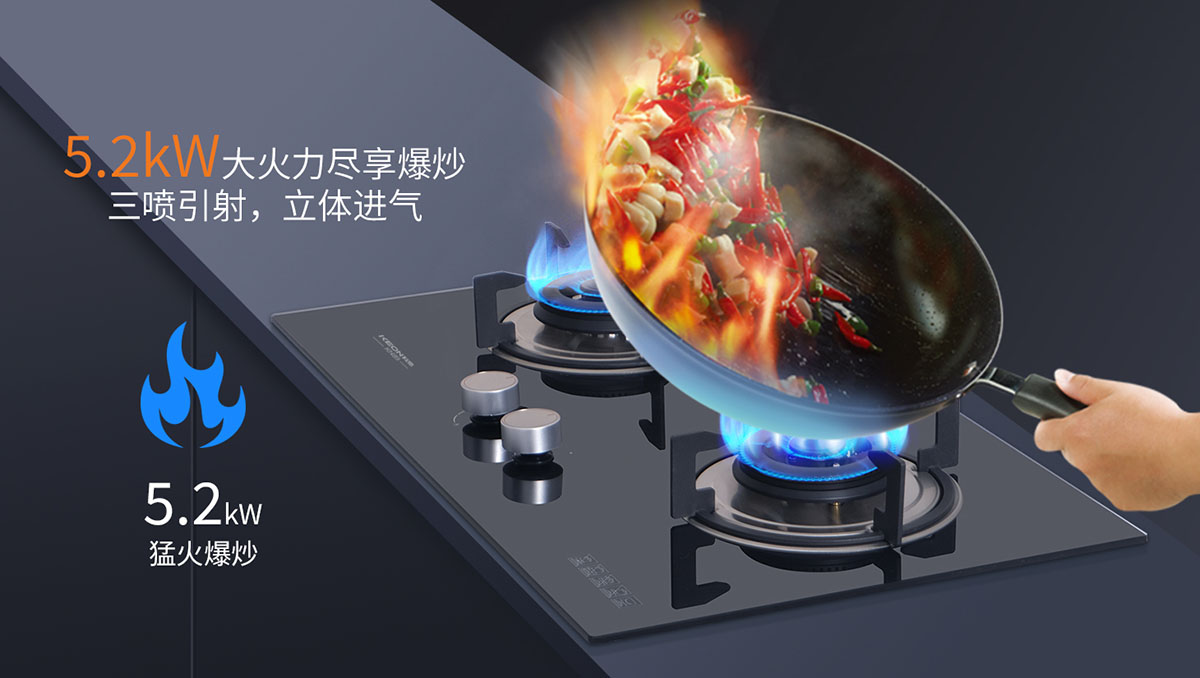 - 三噴引射,立體進氣,5.2kW大火力盡享爆炒